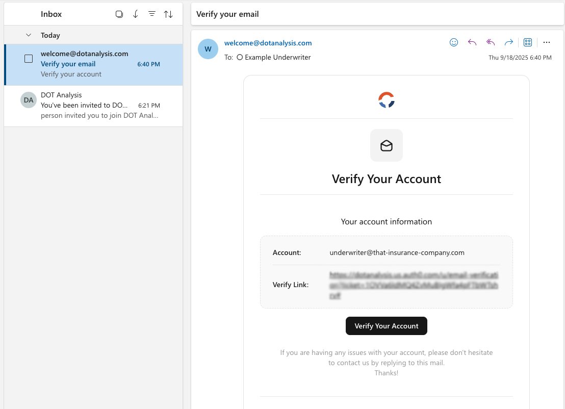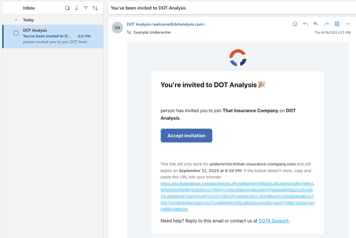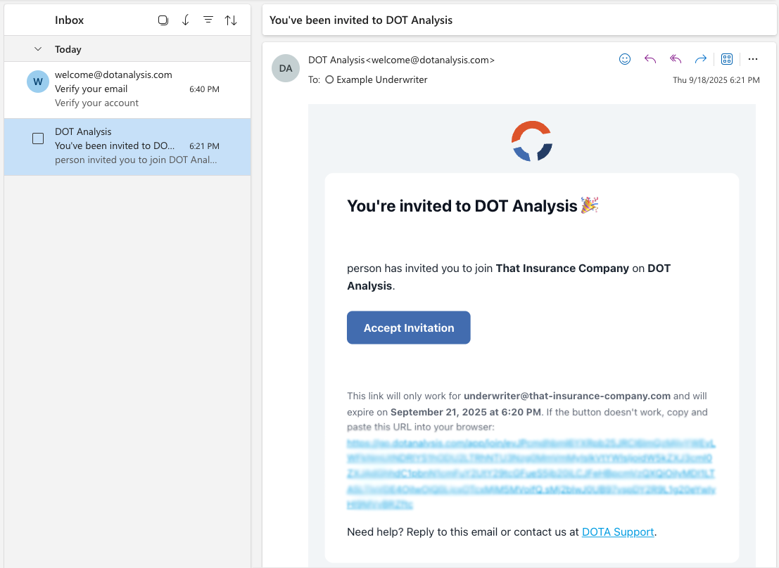 Once invited, you will receive an email from "welcome@dotanalysis.com". To accept the invitation, click "Accept Invitation" or copy/paste the verification URL into your browser. Invitations expire 5 days after being sent.