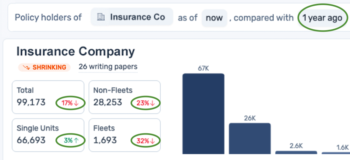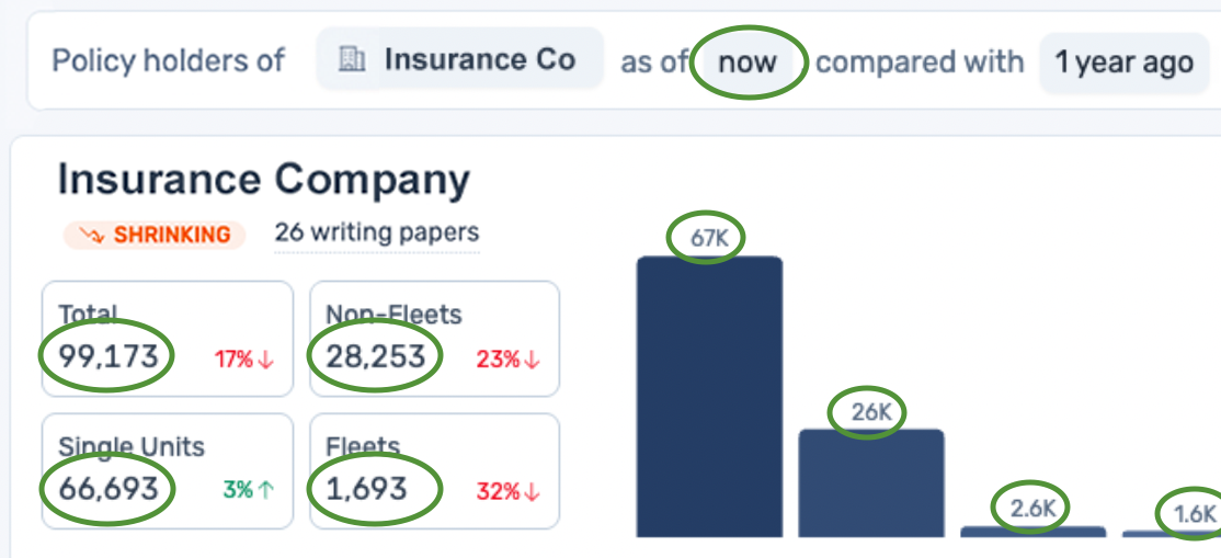 The above example can be read like this; this insurance company has a total of 99,173 policy holders, of which 66,693 are single unit motor carriers, 28,253 are non-fleet motor carriers (26k with 2-5 trucks and 2.6k with 6-9 trucks), and 1,693 are fleets (1.6k with 10-49 trucks, 73 with 50-99 trucks, and 55 with 100 trucks or more).