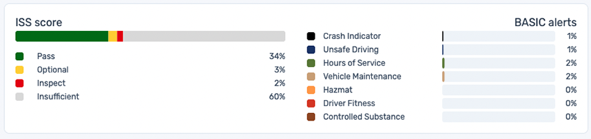 The above ISS score example can be read like this; 34% of this insurer's policy holders have a "pass" ISS score, 3% have an "optional" score, 2% have an "inspect" score, and 60% have insufficient data available for the FMCSA to calculate a score.